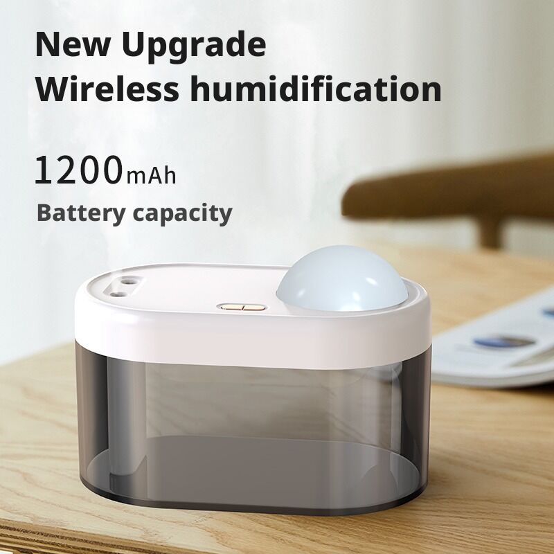 Dieser modernisierte drahtlose Luftbefeuchter verbindet tragbaren Komfort mit magischem Ambiente und ist somit ideal für Schlafzimmer, Reisen und gemütliche Räume.Mit einem schlanken, kompakten Design mit einem runden weißen Oberteil und einem transparenten Wassertank, beherbergt es eine leistungsstarke 1200mAh wiederaufladbare Batterie für den wirklichen drahtlosen Betrieb.