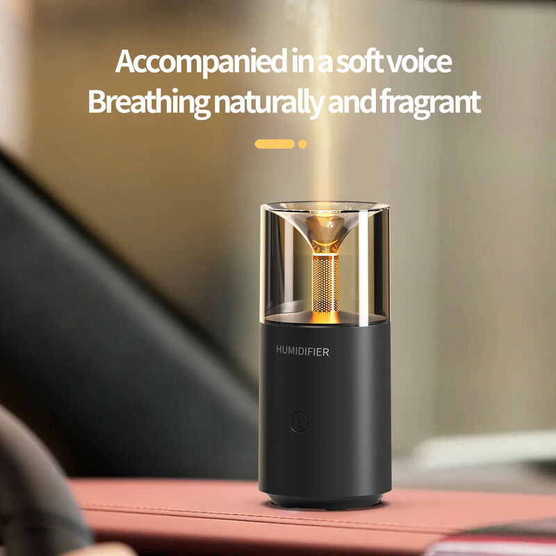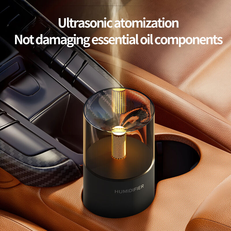 The standout feature is its warm flame-like LED ambiance: the internal light glows with a soft, golden hue (mimicking a gentle flame), casting a cozy glow through the transparent glass top—turning your car’s cabin into a relaxing retreat without distracting from the road. The light pairs beautifully with the fine mist that rises from the top, creating a subtle, immersive vibe.